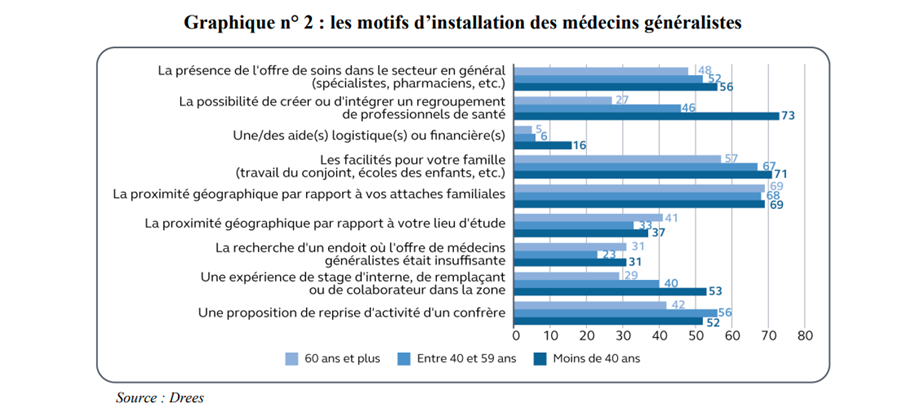 Selon la Drees, deux déterminants conditionnent le choix du lieu d’installation des médecins généralistes : un déterminant professionnel (la qualité et la quantité de travail que peut espérer un médecin sur un territoire) et un déterminant personnel (proximité familiale, facilités pour le conjoint...). Dans ce contexte, "si les aides financières et logistiques ne constituent pas un motif d’installation très important pour les médecins généralistes, il est mentionné près de trois fois plus par les moins de 40 ans que [par] les autres. Il n’est, par ailleurs, pas plus mis en avant par les médecins exerçant en zones sous-denses que [par] les autres", indique la Drees, dans une étude de 2021.