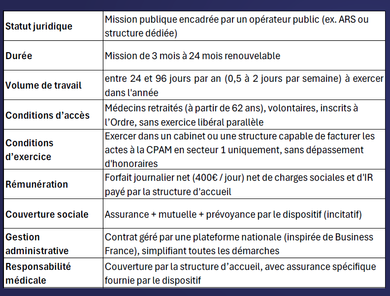 En partant de ce constat-là, j'ai proposé de créer le volontariat du médecin retraité, sur le modèle du VIE ou VIA, qui s'adresse aux jeunes de 18 à 28 ans. Ça leur permet d'aller travailler à l'étranger pour des entreprises (VIE) ou des administrations françaises (VIA). Ça les aide à se développer à l'international. C'est une agence nommée Business France qui gère le contrat et tout l'administratif (assurance, mutuelle…). Il s'agit d'un contrat très simple qui ne fait que trois pages, signé entre l'entreprise et Business France.
