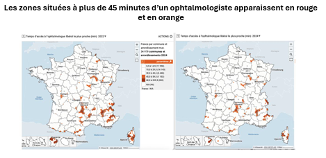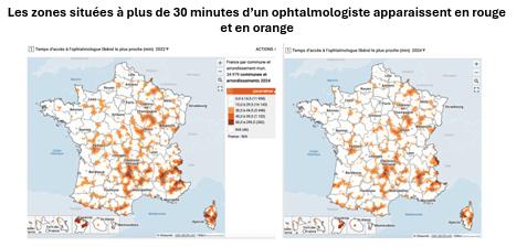 En 2025, 14,6% des ophtalmologistes consultent sur au moins deux lieux (un taux qui culmine à plus de 20% dans les Hauts-de-France ou dans les Pays-de-la-Loire), ce qui représente "626 cabinets supplémentaires répartis sur le territoire". En 2024, le Snof avait déjà montré une nette réduction des délais d'accès à un ophtalmologiste (19 jours pour un contrôle périodique) attribué à une coopération accrue avec les orthoptistes et les opticiens.