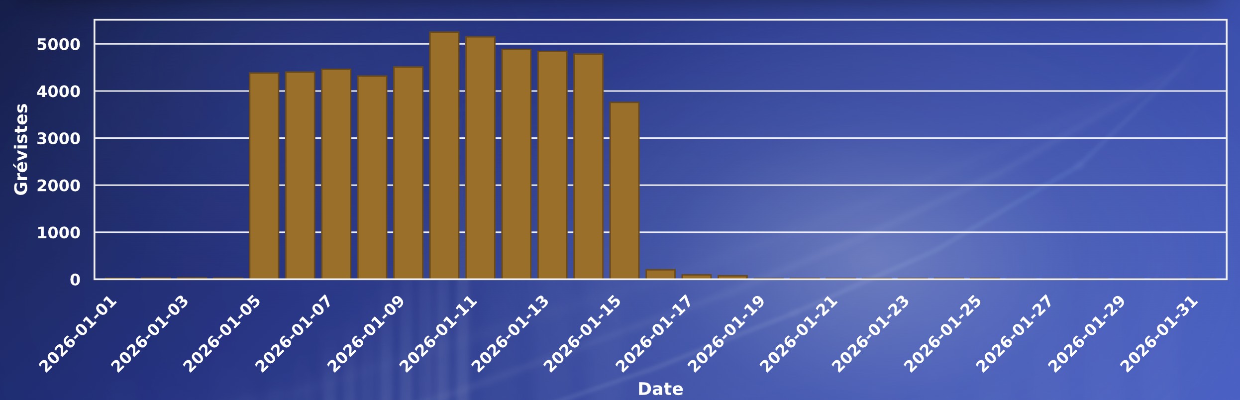 D'après ce premier comptage, le pic de la mobilisation devrait être atteint les 10 et 11 janvier, avec 5000 médecins déclarés grévistes ces jours-là. D'après les données fournies par le syndicat, la moitié sont des généralistes. A noter que les internes, qui disposent d'un numéro RPPS, peuvent également déclarer leurs intentions sur la plateformes.