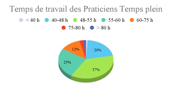 Ainsi, 75% des praticiens hospitaliers répondants dépassent ce plafond légal, 25% travaillent entre 55 et 60 heures par semaine et 15% plus de 60 heures par semaine. Pour un peu plus de la moitié des médecins (53%), leur temps de travail leur semble "trop important" et même "insupportable". "Plus le volume horaire augmente, moins le temps de travail est bien ressenti", analyse le Dr Mathieu Brière, vice-président du syndicat. Et ce mauvais ressenti "est majoritaire dès 39 heures", pointe le syndicaliste. "De manière inattendue, nous n’avons trouvé aucun effet de l’âge des répondants, ni de la situation familiale (notamment parentalité) sur ce résultat", souligne le syndicat.