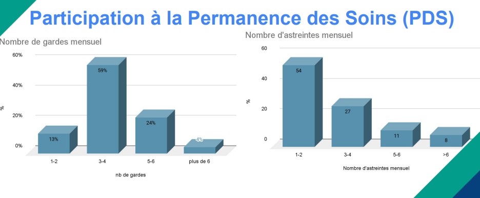 L'enquête montre par ailleurs que 95% des MAR et MIR participent à la permanence des soins : 46% font uniquement des gardes, 6% uniquement des astreintes, 43% les deux.