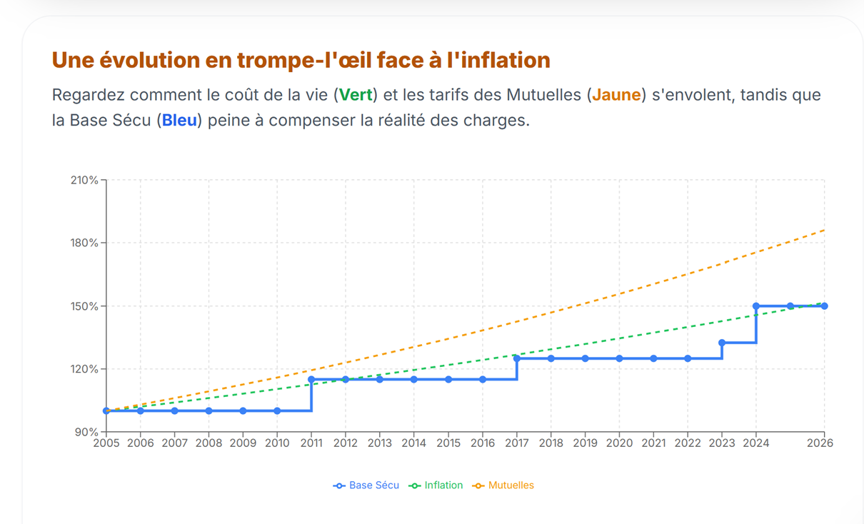 "Imaginez que votre employeur vous donne un Ticket Restaurant de 5€ depuis 2005. À l'époque, ça payait un sandwich. Aujourd'hui, le sandwich coûte 9€. Le boulanger n'a pas augmenté sa marge, c'est votre ticket qui ne vaut plus rien. La base Sécu, c'est ce ticket gelé", comparent les médecins, qui dénoncent un "désengagement progressif de l'Assurance Maladie". "Votre mutuelle vous promet de rembourser '200% du tarif de base'. Mais 200% de presque rien... ça reste peu. Si la base Sécu est obsolète (tarif 2005), même une très bonne mutuelle ne suffit plus à couvrir le coût réel d'un soin en 2026", dénonce le site.