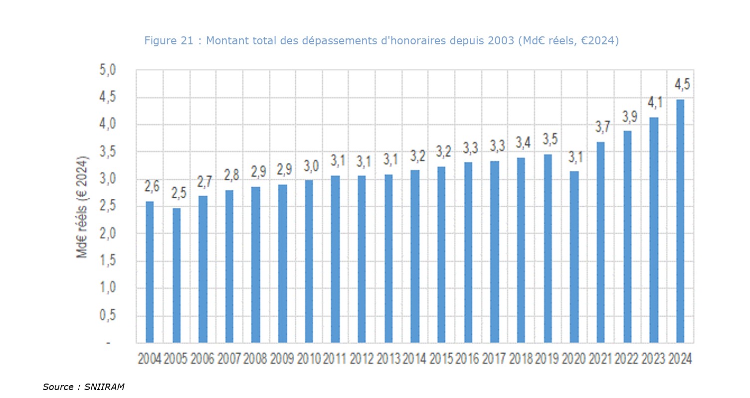 Le montant total des dépassements d'honoraires facturés par les médecins a atteint 4.5 milliards d'euros en 2024, soit une hausse de 7% par an depuis 2021, relève la Cnam dans son rapport Charges et produits pour 2026.