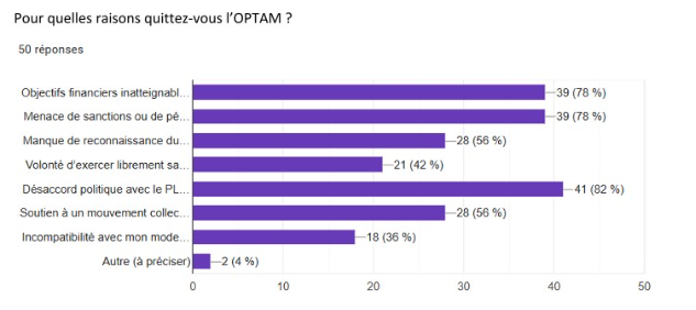 Parmi les raisons qui poussent les praticiens à quitter l'Optam, le "désaccord politique" avec le projet de loi de financement de la Sécurité sociale (PLFSS) pour 2026 – qui doit arriver au Sénat dans les prochains jours – arrive en premier (82% des réponses). Cet argument est suivi par les "objectifs financiers inatteignables" (78%) et les "menaces de sanctions ou de pénalités" (78%).