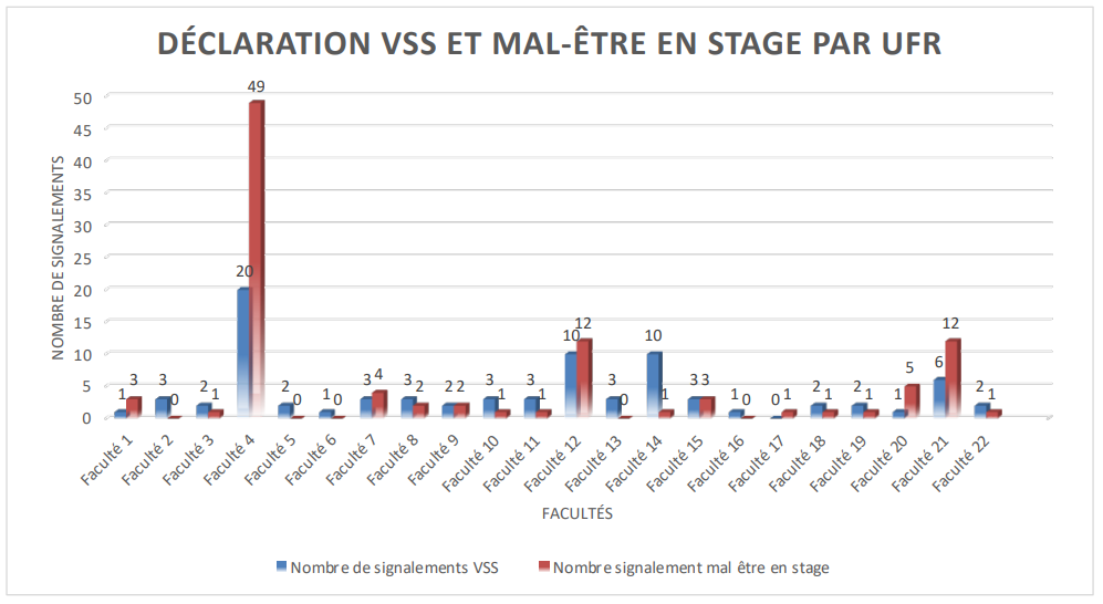 Concernant le recueil et le suivi des signalements pour VSS, 16 UFR sur 22 disposent d'une cellule dédiée, 18 ont mis en place une procédure formalisée et 13 ont un référent identifié pour ces violences. Pour le "mal être en stage", elles sont 15 à compter un référent identifié, 14 UFR déclarent avoir un "dialogue avec les terrains", et 11 une procédure formalisée.