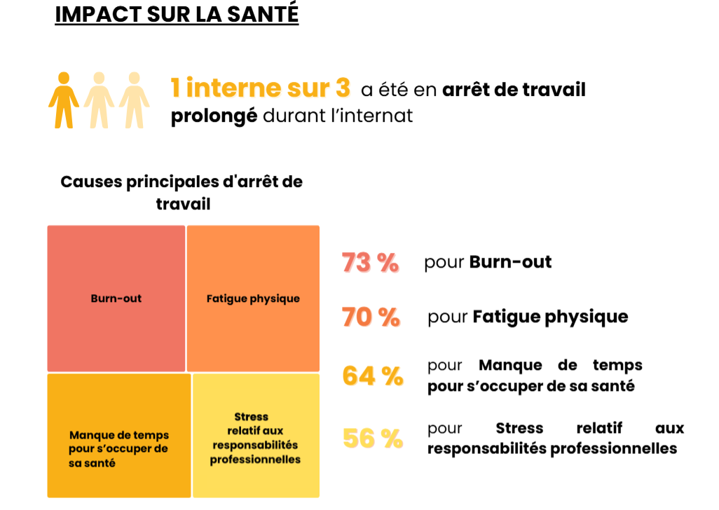 Ces difficultés peuvent avoir un impact sur la santé mentale de ces internes, qui sont un sur trois à avoir déjà été en arrêt de travail prolongé durant leur internat. Selon l'étude, 73% de ces arrêts l'étaient pour burn out, 70% pour fatigue physique et 64% pour manque de temps pour s'occuper de leur santé.